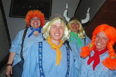 | Zu später Stunde zu Besuch am grossen Uniform-Abend: Biene Maya Annabelle von Bergen, «Michel» Lisabeth Catrina, «Wiki» Judith Eggenberg und «Pippi» Trix Zumbrunn alias Quattro Schtatzjoni. |