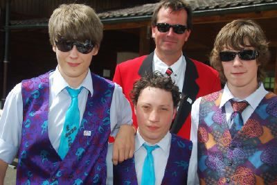 | Ein ganzes Dorf half mit (vlnr): Daniel Geiger, Alain Eggenberg, Adrian Schild, Jonathan Geiger und Dominik von Bergen (vlnr) warten auf ihren Einsatz für die Marschmusik. |